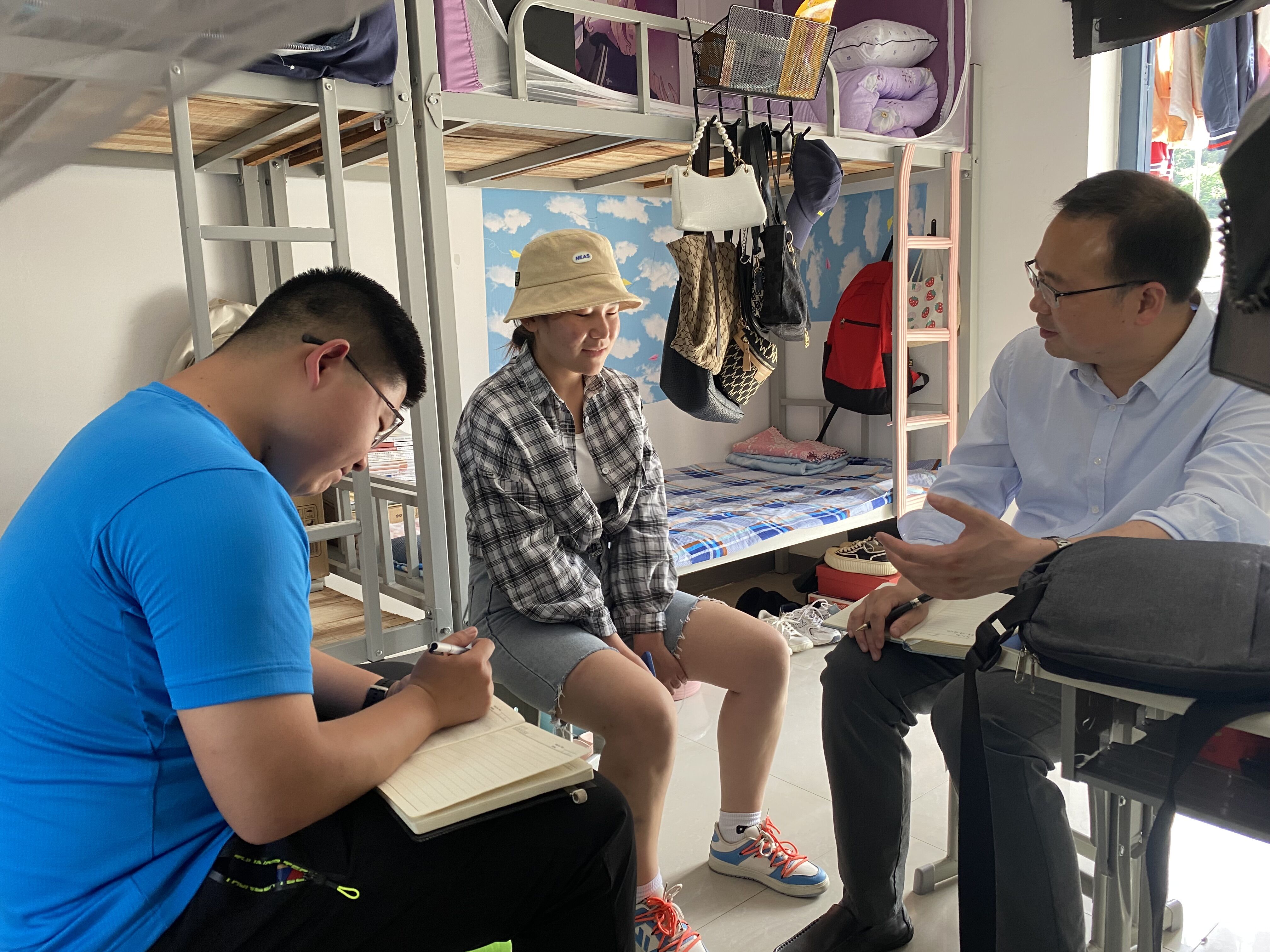 值此机会,张慧和赵新军深入员工寝室,与各自学海领航结对员工展开亲切交谈。张经理与结对员工库加孜在生活习惯适应、学习状态等方面进行交流,并鼓励该同学要以学习为主,争取早日通过自学考试,希望在公司期间能学有所成、学有所获;赵经理与结对员工高晓龙在身体健康、学习生活、校内兼职等方面进行了关心了解。因为公寓在校外镜潭路,两位领导都对员工们的出行安全做了温馨提醒。