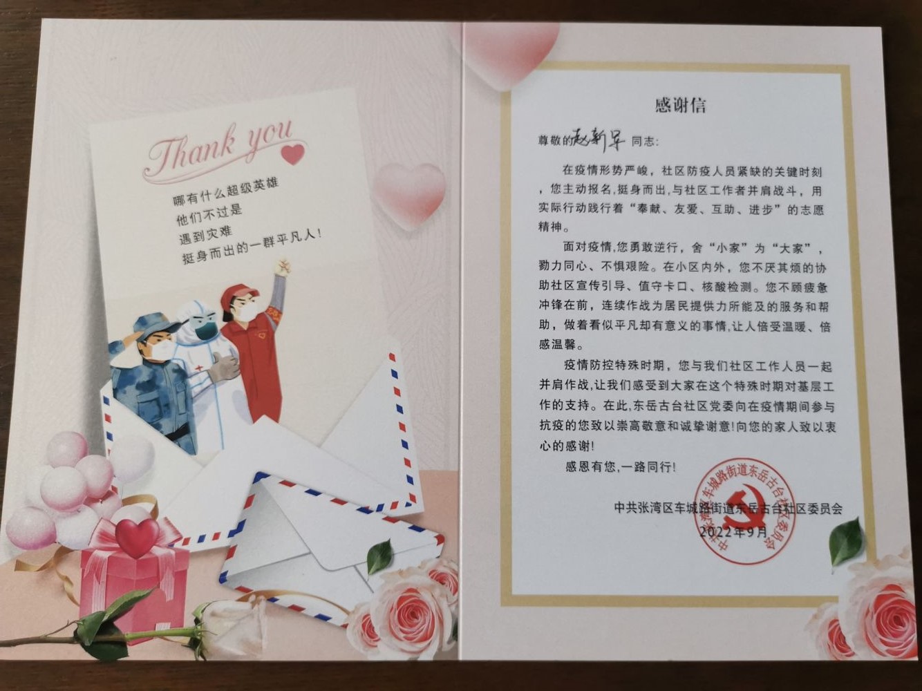 据悉,在本轮疫情期间,公司党总支号召全体党员积极下沉社区,协助社区做好疫情防控工作,这一封感谢信,正是对公司党员干部服务疫情防控工作最好的肯定!