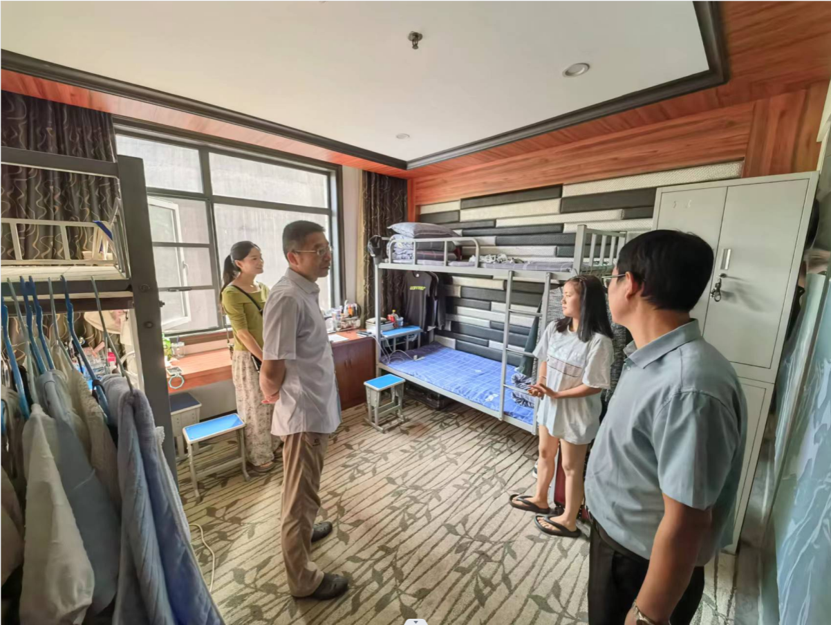 陈海峰一行分别走访了学府公寓男、女生寝室,与在场的员工进行了亲切的交谈,详细询问了员工的学习和生活情况,并嘱咐员工们要珍惜大学时光,努力学习,提高安全防范意识。相关职能部门重点检查了房屋结构、监控设备和消防设施等。