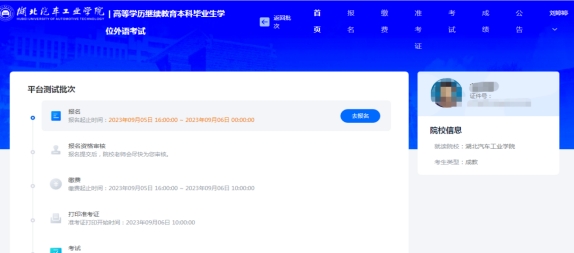 点击【登录】按钮后,若验证成功且符合密码规则,则进入考生首页,可看到当前批次信息如“平台测试批次”,及报考信息流程,当前报名时间已开始。