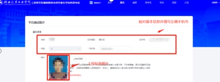 【点击上传】上传照片(系统会按照上传的照片与身份证照片自动核对,核验考生身份证信息与基本信息是否一致,如果不一致,重新上传照片,如果上传超过3次后仍然不一致,待后台老师审核是否通过)