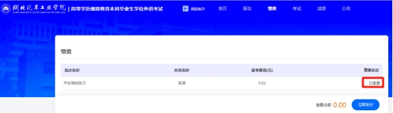 缴费成功后,勾选框默认置灰,默认状态变成“已交费”,说明缴费成功!同时首页报考缴费状态为“报考已缴费”